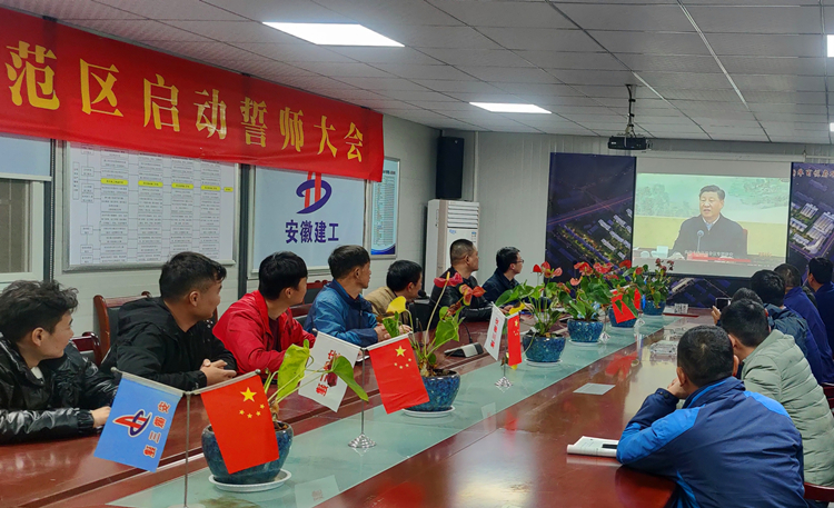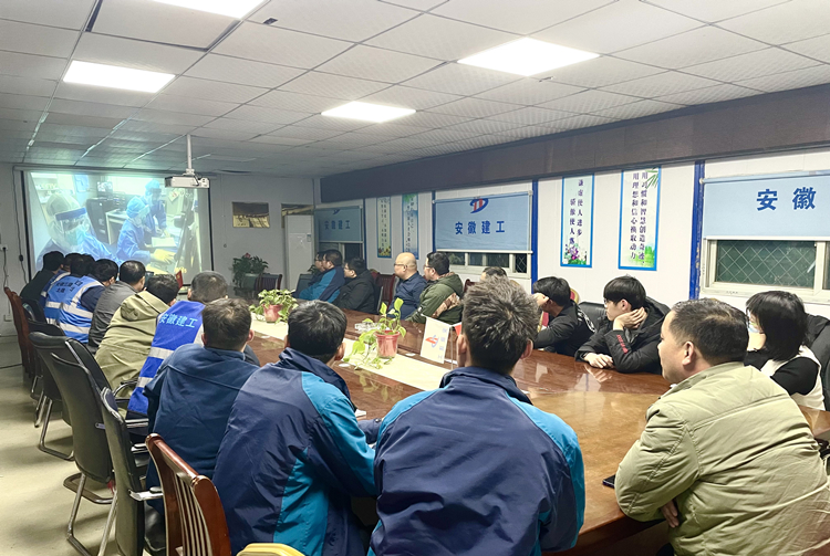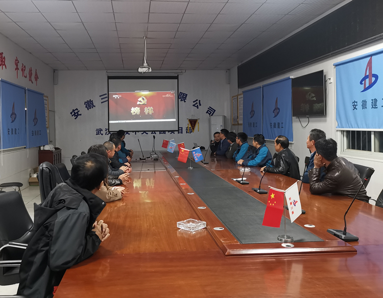 在六安第一中學擴建項目會議室,當天晚上參與項目建設(shè)的四公司、安裝公司、門窗公司聯(lián)合組織項目黨員及管理人員集中觀看專題片。次日一早,裝飾也組織六安一中項目參戰(zhàn)管理人員集中收看專題片,汲取榜樣力量。
