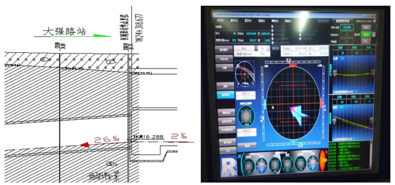 嚴(yán)控盾構(gòu)始發(fā)姿態(tài)。盾構(gòu)始發(fā)姿態(tài)決定了后續(xù)施工成敗,是盾構(gòu)施工重中之重??紤]到盾構(gòu)機(jī)自身重心靠前,始發(fā)掘進(jìn)時(shí)易產(chǎn)生向下的“磕頭”現(xiàn)象,項(xiàng)目部將盾構(gòu)始發(fā)軸線比設(shè)計(jì)軸線抬高20mm。此外,因車站底板自西向東為2‰縱坡,盾構(gòu)進(jìn)洞為26‰下坡。按照一般狀況抬高始發(fā)軸線易導(dǎo)致侵限。項(xiàng)目查找合肥市軌道交通前期其他盾構(gòu)隧道施工的經(jīng)驗(yàn),結(jié)合大強(qiáng)路站地質(zhì)情況,調(diào)整盾構(gòu)始發(fā)軸線,將盾構(gòu)始發(fā)軸線抬高改為5‰下坡,有效避免了盾構(gòu)管片侵限。
