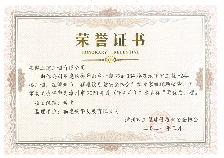 5月17日,公司收到漳州市工程建設(shè)質(zhì)量安全協(xié)會(huì)寄來的獎(jiǎng)杯和獎(jiǎng)狀,由安徽三建廈門公司負(fù)責(zé)實(shí)施的御景山莊一期22#樓-33#樓及地下室工程榮獲“水仙杯”優(yōu)質(zhì)工程獎(jiǎng),該獎(jiǎng)項(xiàng)是漳州市工程建設(shè)質(zhì)量最高獎(jiǎng)項(xiàng)。