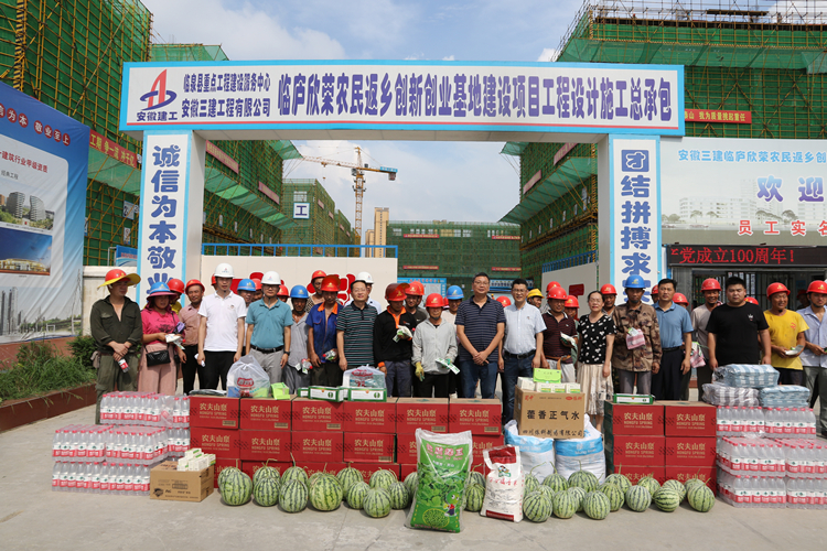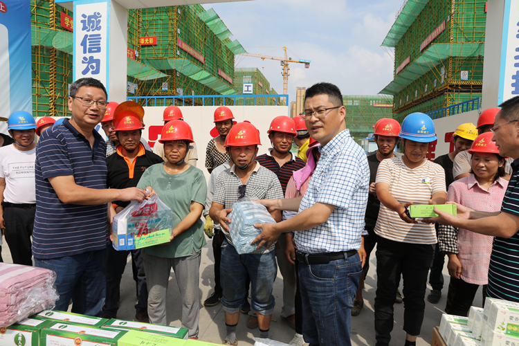 連日來,臨泉縣持續(xù)高溫,為深入開展“我為群眾辦實事”實踐教育活動,7月21日,臨廬產業(yè)園管委會與公司工會共同深入項目施工現(xiàn)場開展“送清涼,送健康,送關愛”活動,為項目一線員工送去了夏日關懷,同時叮囑項目管理人員嚴格做好夏季施工作業(yè)的各項防護工作,確保高溫天氣施工安全。臨廬產業(yè)園管委會副主任曹曙光、規(guī)劃建設局局長臧應,公司副總經理張為政等參加慰問。