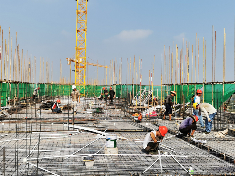 為了按時完成甲方的預(yù)售節(jié)點(diǎn),迅速推進(jìn)工程進(jìn)度,分公司上下齊心協(xié)力。一方面,分公司副經(jīng)理魯豫、孫剛不間斷地蹲點(diǎn)項(xiàng)目,統(tǒng)籌協(xié)調(diào)項(xiàng)目重難點(diǎn)工作,合理調(diào)配現(xiàn)場人材機(jī),并抽調(diào)收尾項(xiàng)目項(xiàng)目經(jīng)理、技術(shù)負(fù)責(zé)、生產(chǎn)經(jīng)理等5名骨干人員到該項(xiàng)目,他們主動分片包干,保棟號、搶進(jìn)度,經(jīng)過25天的艱苦努力,成果顯著,滿足施工節(jié)點(diǎn)要求;另一方面,項(xiàng)目積極協(xié)調(diào)樁基單位夜以繼日,迅速出土,每天保持6臺以上施工挖機(jī),木工班組和鋼筋班組每棟樓人數(shù)維持在40人以上,確保一天完成一棟基礎(chǔ)。重點(diǎn)工序采取24小時兩班倒作業(yè),做到“人歇機(jī)不歇”。為了不影響第二天鋼筋綁扎,防水施工通常是通宵加班完成。在塔吊、汽車吊覆蓋不到的地方,大家就手提、肩抗,晚上鋼筋綁扎完成,就馬上澆筑砼。此外,各項(xiàng)工序均要求班組長根據(jù)施工進(jìn)度計(jì)劃目標(biāo)做好施工計(jì)劃安排,確保各工序的銜接和工序循環(huán),并針對每天完成的實(shí)際情況,實(shí)行動態(tài)調(diào)整。