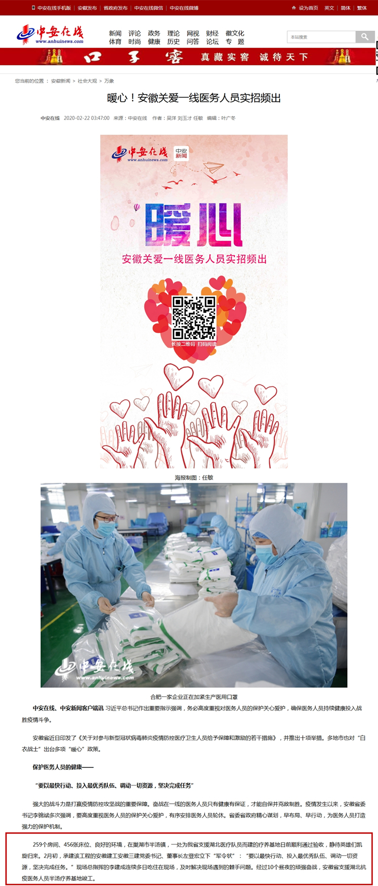 中安在線、央廣網(wǎng)、中新網(wǎng)、國(guó)際在線——暖心!安徽關(guān)愛一線醫(yī)務(wù)人員實(shí)招頻出 發(fā)布時(shí)間:2020-02-26 來(lái)源:中安在線、央廣網(wǎng)、中新網(wǎng)、國(guó)際在線 撰稿人: 瀏覽次數(shù):15696 網(wǎng)址鏈接: 中安在線:http://ah.anhuinews.com/system/2020/02/22/008352394.shtml 央廣網(wǎng):http://news.cnr.cn/native/gd/20200222/t20200222_524987284.shtml 中新網(wǎng):http://www.chinanews.com/sh/2020/02-22/9101239.shtml 國(guó)際在線: http://news.cri.cn/20200222/6faa4074-5d1b-ef06-5944-b8a7ca8d5931.html