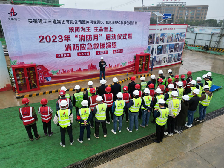11月9日上午,四分公司承建的潭沖河家園D、E地塊EPC總承包項目部開展2023年“消防月”啟動儀式暨消防應急救援演練活動。