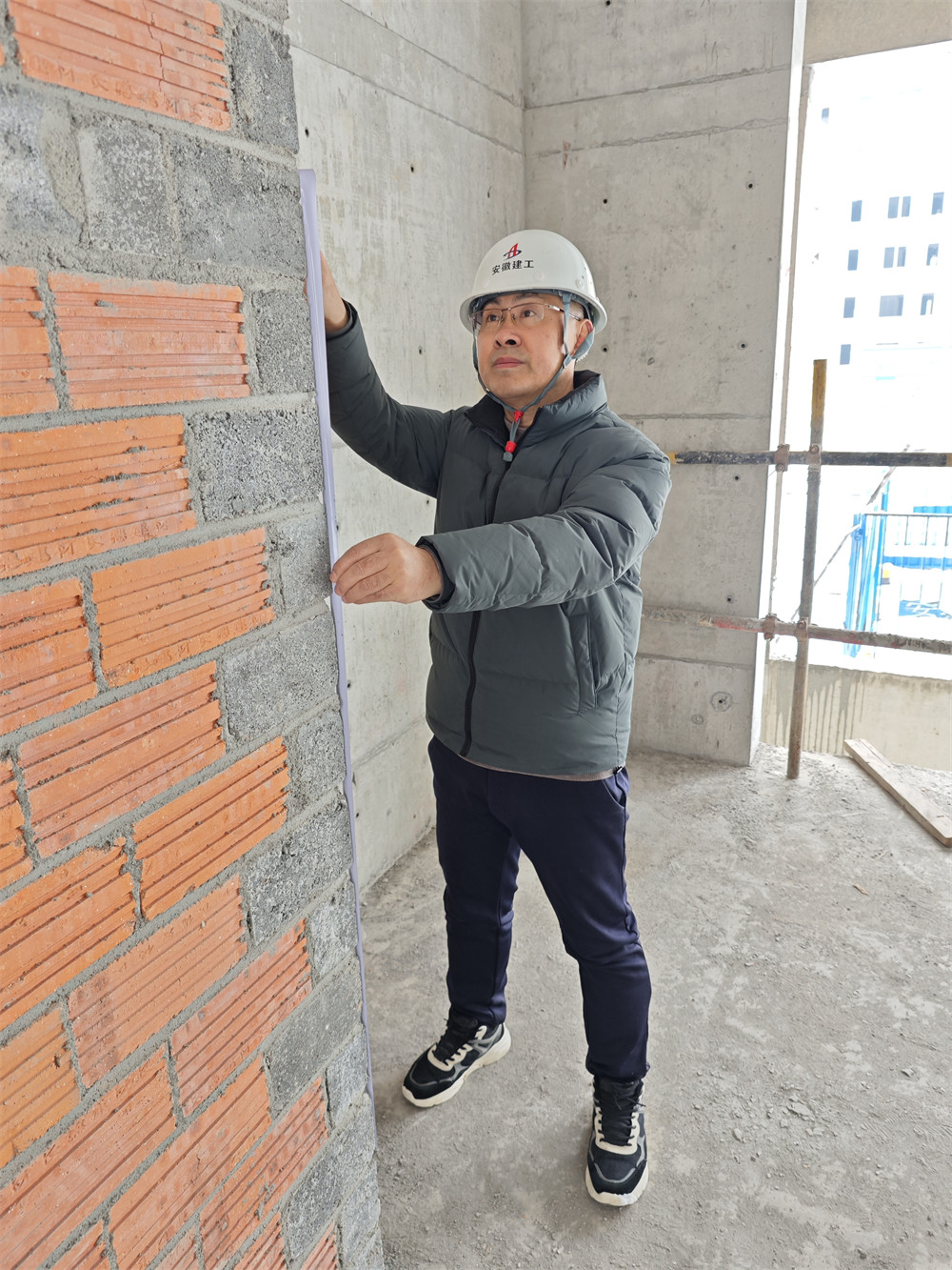 “項(xiàng)目全體職工加班加點(diǎn)奮斗在一線,保進(jìn)度保質(zhì)量,就是為了給業(yè)主們一個(gè)滿意的答復(fù)?!奔夹g(shù)負(fù)責(zé)虞玉東正在檢查煤矸石砌體馬牙槎的尺寸及砌體磚縫厚度。