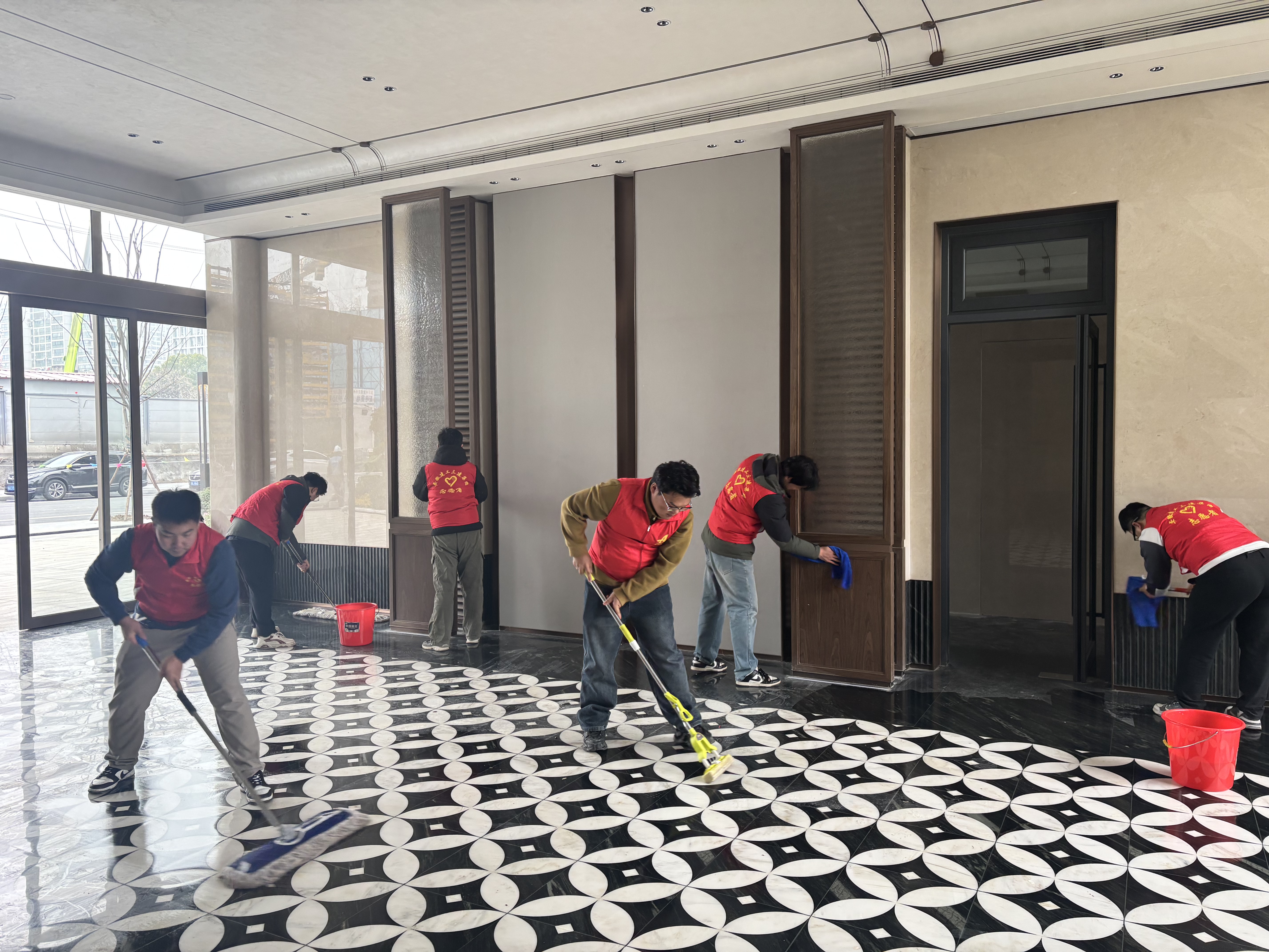 裝飾公司團支部組織青年團員前往王衛(wèi)片區(qū)城市更新總承包項目開展學雷鋒志愿服務(wù)活動,有的擦玻璃、有的拖地、有的鏟墻上遺留的膠等,經(jīng)過近一個小時的奮戰(zhàn),現(xiàn)場煥然一新。