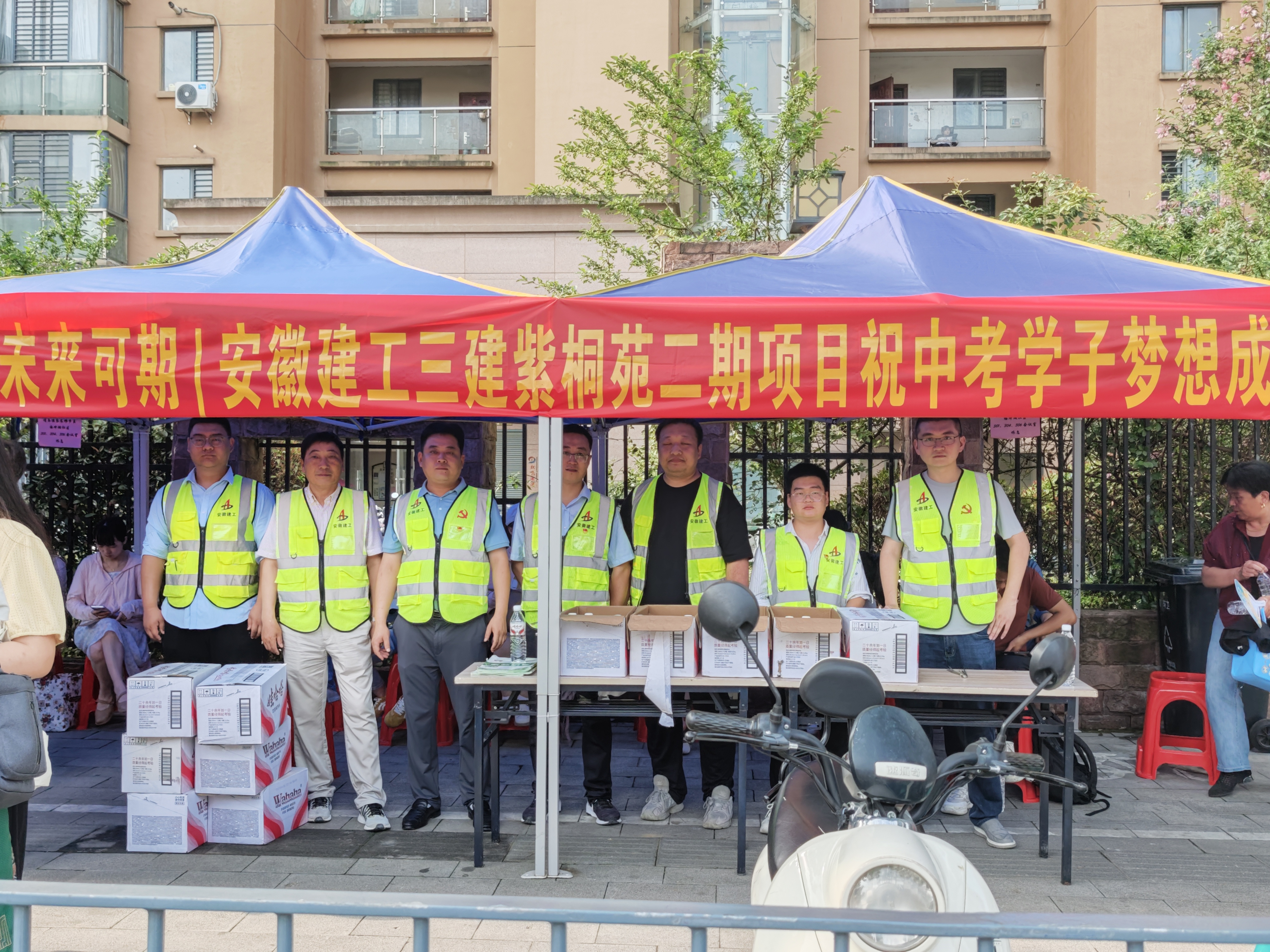 6月14日,紫桐苑二期項目組織黨員及青年骨干開展“為中考護航”公益活動。項目團隊在合肥四十二中北城世紀城校區(qū)考點附近設(shè)立愛心休息區(qū),為學子及家長免費提供礦泉水、防暑物資及休憩場所,為學子加油鼓勁。
