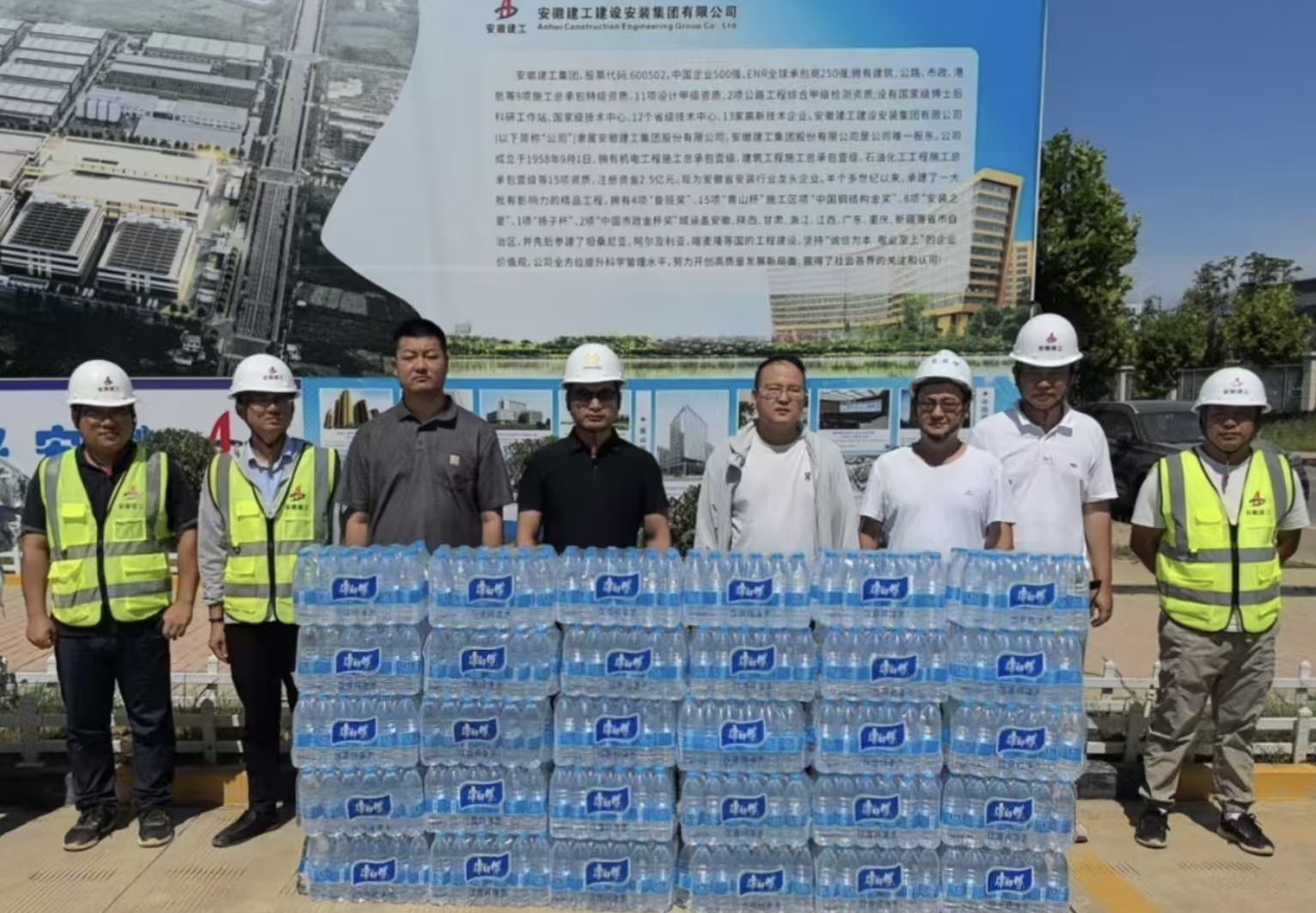 7月10日上午,鳳陽縣重點(diǎn)工程建設(shè)管理服務(wù)中心質(zhì)量安全股主任姜銳一行到公司鳳陽縣小崗村農(nóng)產(chǎn)品加工產(chǎn)業(yè)園三期建設(shè)北區(qū)項(xiàng)目調(diào)研開工建設(shè)情況,并為高溫堅(jiān)守崗位的一線建設(shè)者“送清涼”。