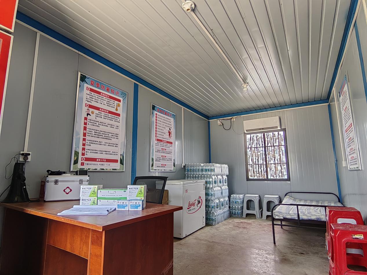 面對(duì)夏季高溫挑戰(zhàn),項(xiàng)目部堅(jiān)持“以人為本、科技賦能、預(yù)防為主”的原則,制定“1+N”高溫專項(xiàng)施工方案,讓工人安心施工。在作業(yè)時(shí)間上,根據(jù)氣溫動(dòng)態(tài)調(diào)整:37℃以下實(shí)行 “早出工、晚收工、中午休”的兩班倒模式;37℃以上則采取“白天培訓(xùn)、夜間施工”的方式,避開10:00-16:00的高溫時(shí)段。同時(shí),防暑保障實(shí)現(xiàn)全覆蓋,現(xiàn)場(chǎng)設(shè)立配備空調(diào)、飲水機(jī)和急救箱的醫(yī)務(wù)室,每日供應(yīng)綠豆湯、冰鎮(zhèn)鹽汽水等飲品,并發(fā)放藿香正氣水、風(fēng)油精及大冰塊等防暑物資,切實(shí)保障作業(yè)人員健康安全。