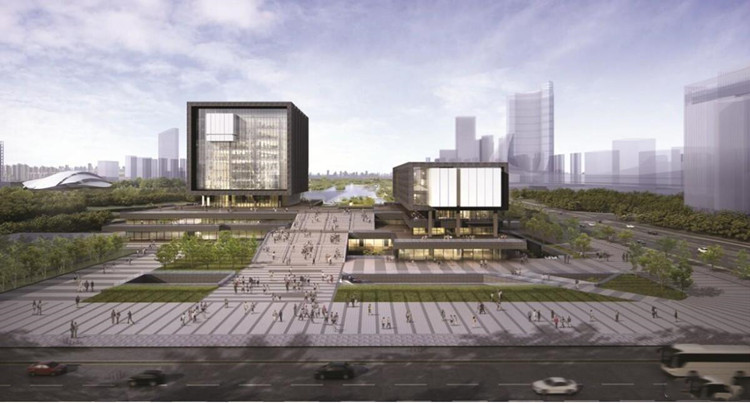 據(jù)悉,該項目位于政務區(qū)翡翠路與祁門路交口東北角,包括:圖書館主體建筑(含城市展示館、超級書庫等)以及廣場、道路、景觀、車庫等相關附屬設施。其中北側的中心圖書館地上11層,建筑高度63米,南側為文化展示中心地上5層,建筑高度33米。