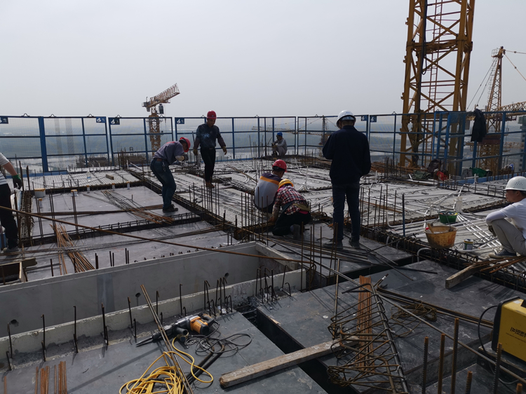 七公司天長恒大湖山半島三標(biāo)段項目、中海江北G06地塊一標(biāo)段兩項目:五一期間,約400位一線職工集體加班搶進度,澆筑混凝土、綁扎鋼筋,澆筑防水保護層。
