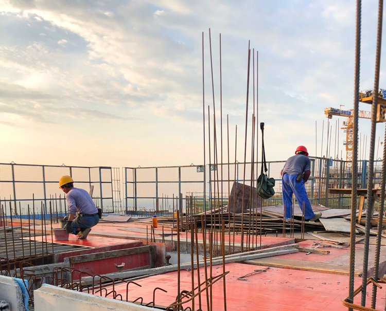 一公司和風福灣項目一線職工頭頂烈日綁扎、焊接鋼筋、抄平、防線,汗水見證奮斗!