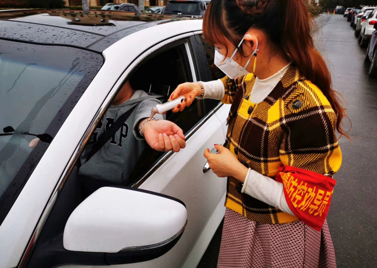 陽(yáng)海英在小區(qū)為往來(lái)人員測(cè)量體溫