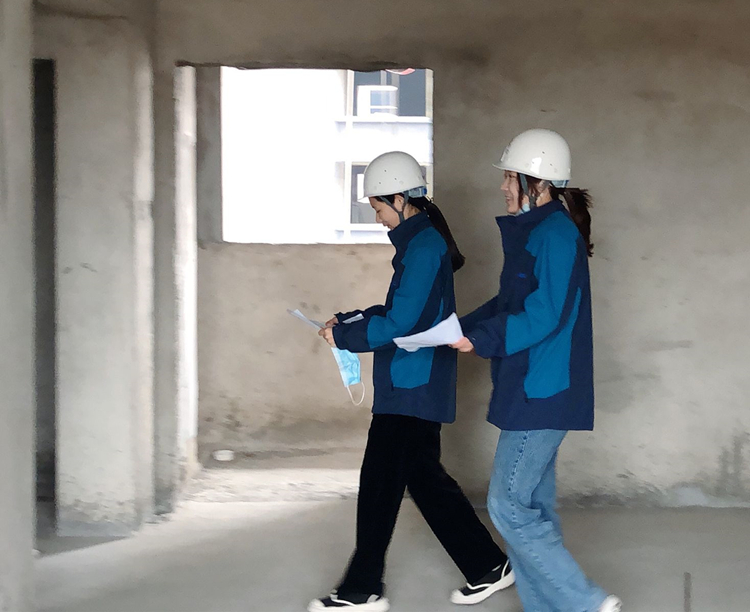 八公司臨泉銀杏苑項目資料員程妙錚、陸晴復(fù)核現(xiàn)場標(biāo)高、開間、凈高