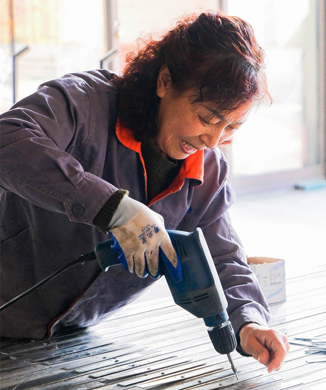 門窗公司女工王來菊在車間工作區(qū)域進行材料加工工作,搶門窗生產(chǎn)進度
