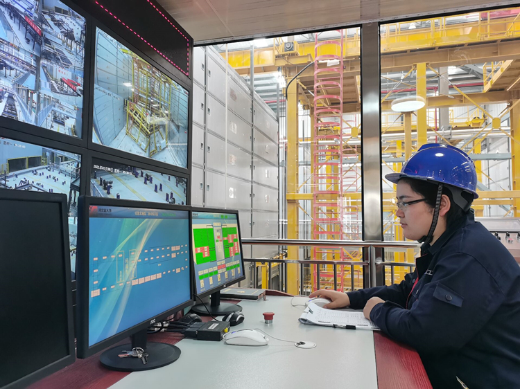北城工業(yè)公司養(yǎng)護窯中央控制室操作員黃霜正在使用碼垛車進行構(gòu)件存取操作